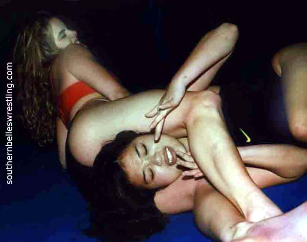 This amateur match is in a pro ring and LeAnne at first seems distracted by the confines of the ropes. Kim takes full advantage of LeAnne’s uncertainty and surprises her opponent with her strength and skill. But it doesn’t take LeAnne long before she is matching Kim hold for hold and a titanic struggle between two powerful fighters is on!